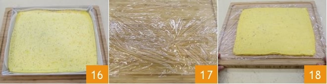 Quando a omelete estiver assada, retire a assadeira 16, coloque filme plástico em uma tábua 17; vire a assadeira sobre ele e retire delicadamente o papel manteiga, depois deixe esfriar 18.