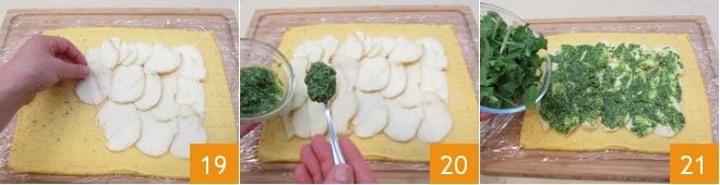 Quando a omelete estiver fria, recheie colocando as fatias de provolone defumado 19 e espalhe o pesto de rúcula que você preparou anteriormente 20. Em seguida, cubra com folhas de rúcula fresca previamente lavadas 21