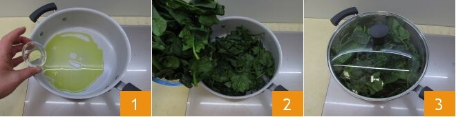 Para preparar o rocambole de ricota e espinafre, comece cozinhando esses últimos. Lave os espinafres e seque-os com papel toalha. Em seguida, despeje o óleo em uma panela, adicione o alho 1, deixe-o dourar e adicione também os espinafres 2. Cubra tudo com uma tampa 3