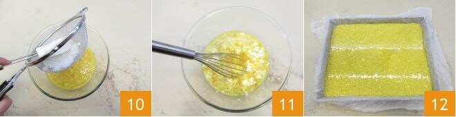 Peneire a ricota diretamente na mistura 10 e misture-a ao restante mexendo com um batedor 11. Despeje tudo em uma forma 12 de 34x27 cm, forrada com papel manteiga levemente untado. Asse em forno estático pré-aquecido a 180° por cerca de 25 minutos (se usar forno ventilado, asse a 160° por 15/20 minutos). A omelete deve ficar macia e compacta, não queimada na superfície.