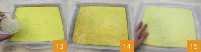 Após esse tempo, retire a omelete do forno e polvilhe toda a superfície com o Grana Padano DOP reservado anteriormente 13. Leve novamente ao forno por mais 10 minutos para deixar o queijo derreter e criar uma crosta dourada agradável. Quando a omelete estiver pronta, retire a forma do forno 14, coloque filme plástico em uma tábua; vire a forma sobre ela e retire delicadamente o papel manteiga, depois deixe esfriar 15.