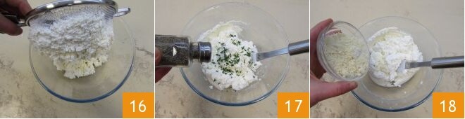 Enquanto isso, cuide da ricota. Peneire-a diretamente dentro de uma tigela 16, em seguida, adicione as folhas de tomilho e ajuste o sal e a pimenta 17. Por último, adicione também o Grana Padano DOP 18 e misture tudo.