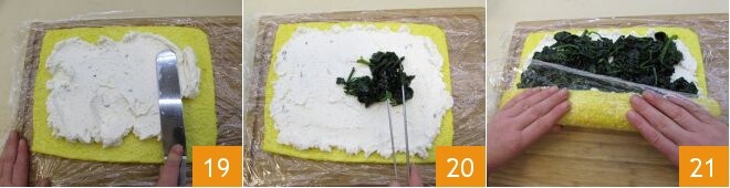 Quando a omelete estiver fria, recheie-a espalhando a ricota sobre toda a superfície 19 e colocando por cima os espinafres 20 (que já terão perdido o excesso de líquido). Neste ponto, com a ajuda do filme plástico, comece a enrolar a omelete 21.