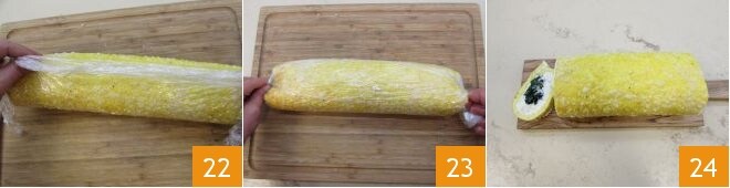 Certifique-se de enrolá-la bem apertada 22, tentando apertá-la o suficiente para que fique compacta; feche as extremidades como se fosse uma bala, apertando bem o filme plástico 23 para que mantenha a forma. Em seguida, coloque o rocambole de omelete com ricota e espinafre na geladeira para que se compacte e se insira por pelo menos 1 hora. Após o tempo necessário, retire delicadamente o filme plástico do rocambole, corte-o em fatias 24 e o seu rocambole de omelete recheado estará pronto para ser servido!