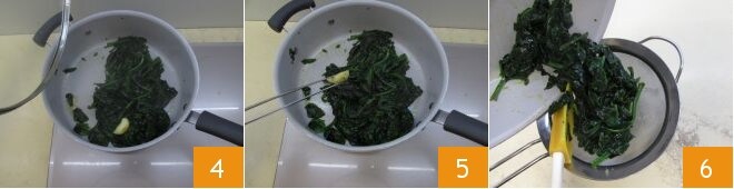 e cozinhe por cerca de dez minutos até que os espinafres murchem 4. Neste ponto, retire o alho 5 e transfira os espinafres para uma peneira 6; assim, eles esfriarão e perderão o excesso de líquido.