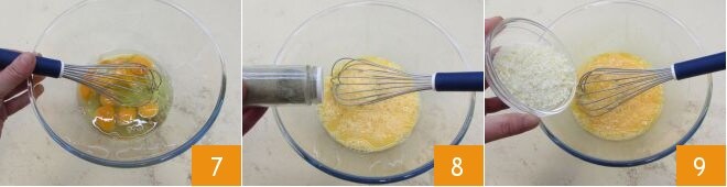 Cuide de fazer a omelete: quebre os ovos em uma tigela 7, bata-os levemente com um batedor e ajuste o sal e a pimenta 8. Neste ponto, adicione 50 g de Grana Padano DOP ralado 9 e incorpore-o à mistura de ovos, reservando os 30 g restantes.