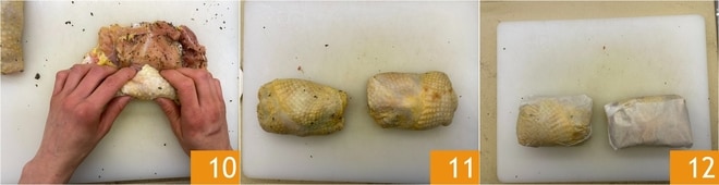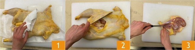 Para preparar o rolê de capão com purê de aipo-rábano, como primeira coisa, faça o molho escuro, você pode seguir nossa receita. Depois, pegue um capão desossado no açougue. Queime eventuais penas com um maçarico, depois lave-o sob água corrente e seque-o com papel toalha 1. Separe as coxas do peito 2, depois desosse-as também, removendo o osso central e achate-as 3.