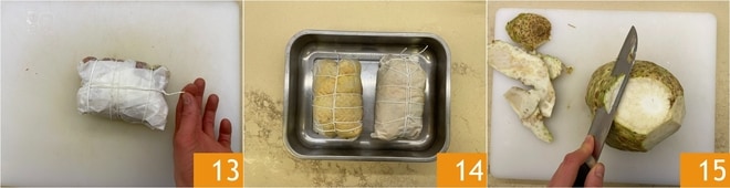 Amarre-as com barbante, como se fosse um assado 13, e coloque-as dentro de uma assadeira 14. Coloque na prateleira inferior do forno uma assadeira com água que servirá para criar o efeito de vapor, pré-aqueça o forno a 180°C e coloque a assadeira com o capão na prateleira superior. Asse por 30 minutos. Enquanto isso, prepare o purê de aipo-rábano. Coloque no fogo uma panela cheia de água, adicione sal e deixe ferver. Descasque então o aipo-rábano 15.