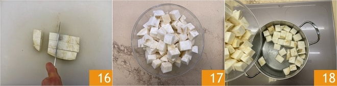 Corte-o em cubos 16 e vá colocando-os em uma tigela 17. Quando a água começar a ferver, mergulhe o aipo-rábano e cozinhe por 10 minutos 18.