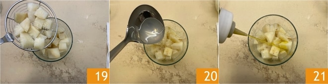 Escorra o aipo-rábano e transfira-o para um recipiente alto e estreito 19. Adicione uma concha da água de cozimento e um pouco de óleo 21.