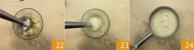 Tempere com sal, pimenta e bata tudo com um mixer de imersão 22 até obter um purê liso 23. Em seguida, transfira o purê para uma panela pequena 24 e mantenha-o aquecido.