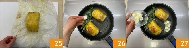 Depois dos 30 minutos, retire o capão do forno e remova o barbante e o papel manteiga 25. Coloque-o em uma frigideira quente com um fio de óleo e doure-o bem. Adicione então alecrim e alho 26 e a manteiga 27.
