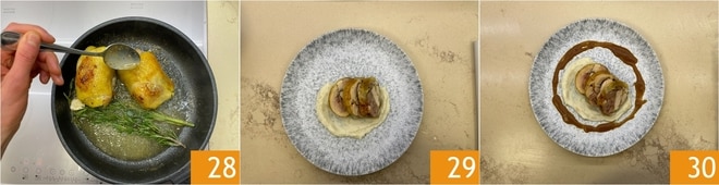 À medida que a manteiga derrete, use-a para regar e dar sabor ao capão 28. Quando estiver bem dourado, desligue o fogo e emprate. Posicione na base o purê de aipo-rábano, depois o capão em fatias 29 e, por último, adicione o molho escuro quente 30.