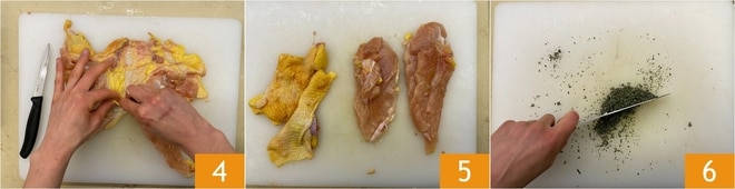 Separe a pele do peito 4 e divida o peito ao meio 5. Faça um picadinho com alecrim, tomilho e sálvia 6.
