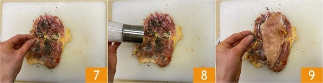 Coloque a coxa desossada sobre uma tábua e tempere-a com um pouco do picadinho aromático 7, sal 8 e pimenta. Coloque o peito por cima 9 e adicione mais picadinho, sal e pimenta.