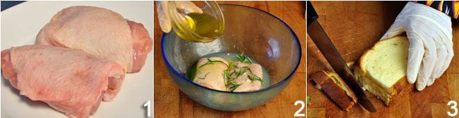 Para preparar as rustichelle de frango em crosta de pan brioche, começa-se com a marinada das sobrecoxas 1. Basta misturar todos os ingredientes da marinada, mergulhar as sobrecoxas 2, cobrir com plástico-filme e deixar na geladeira por uma hora, virando de vez em quando. Para a cobertura, elimina-se as bordas e rala-se 4 o pan brioche (se quiser, é possível usar o mixer) e adiciona-se o resto dos ingredientes.