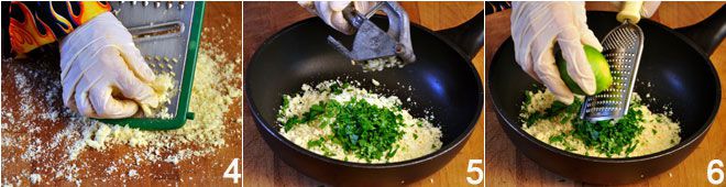 Para a cobertura é bom fazer uma distinção com base no tipo de cozimento. No caso de usarmos uma chapa no fogão, vamos torrar na frigideira a cobertura feita de pan brioche esfarelado, salsinha picada, alho amassado 5, raspas de limão raladas 6 e óleo 7 e passaremos o frango nela somente depois de cozido.