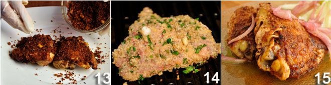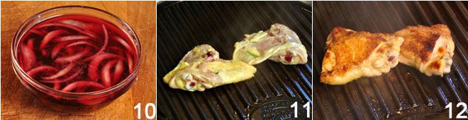 Se o frango foi cozido na chapa, realize a cobertura 13 e sirva adicionando a salada de maçãs como acompanhamento, cobrindo-a com alguns fios de cebola marinada. Se usarmos um churrasco clássico, é bom preparar a cobertura "a cru" 14 e passá-la na carne antes de cozinhá-la na grelha. Esta distinção é importante não apenas por uma questão de sabor, mas principalmente funcional: a cobertura na chapa tenderia a queimar e fazer muita fumaça na cozinha. Do lado de fora, pode ser um problema marginal.