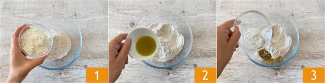 Para preparar em casa a rustichella integral, em uma tigela coloque a farinha integral, a farinha 0 1, o azeite extra virgem 2 e o fermento instantâneo 3.