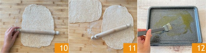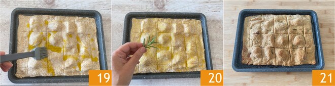 Unte a superfície 19 e adicione o alecrim fresco 20. Cozinhe a rustichella integral em forno já pré-aquecido, em modo estático, a 180° por 30 minutos. Retire do forno 21, corte em quadradinhos e sirva quente.