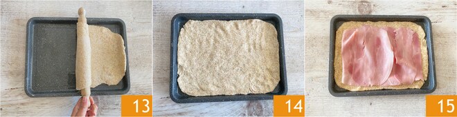 Coloque a primeira base integral enrolando-a ao redor do rolo 13 14. Recheie a rustichella com as fatias de presunto cozido 15.