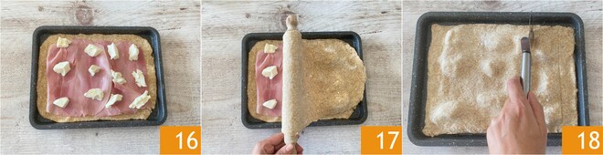 Adicione também o stracchino usando duas colheres de chá 16. Cubra com a segunda base integral 17 e sele bem as bordas. Com uma carretilha faça incisões na superfície tanto horizontalmente quanto verticalmente 18.