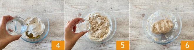 Adicione a água morna 4 e misture com uma colher de pau apenas para absorver os líquidos. Adicione o sal 5 e comece a amassar com a ponta dos dedos até que a massa fique homogênea 6.