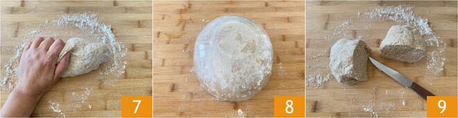 Transfira a massa da rustichella para uma superfície de trabalho levemente enfarinhada 7 e amasse até obter um pão macio e elástico. Cubra-o com a própria tigela 8 e deixe descansar por 10 minutos. Corte o pão em dois pedaços de mesmo peso 9.