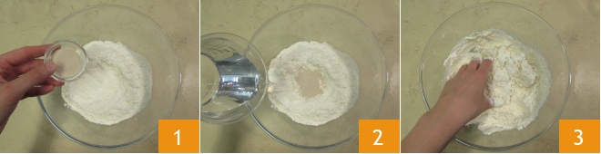 Para preparar o rústico com salame e flores de abóbora, comece pela massa levedada: em uma tigela, despeje a farinha, o fermento 1, a água 2 e comece a amassar com as mãos 3.