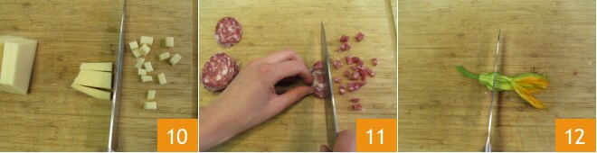 Enquanto isso, corte em cubos de cerca de 5 mm o queijo 10 e o salame 11. Por último, limpe as flores de abóbora cortando a base 12.