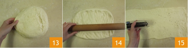 Quando a massa estiver levedada, vire-a sobre a bancada levemente enfarinhada 13 e abra-a com a ajuda de um rolo, obtendo um retângulo de cerca de 70 cm de comprimento e 30 cm de largura 14. Polvilhe com um pouco de pimenta 15.