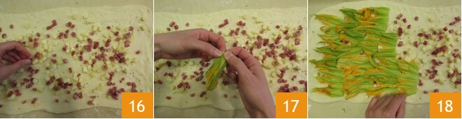 Deixe um par de cm das bordas e coloque no meio os cubos de queijo e salame 16, por fim, abra ao meio as flores de abóbora 17 e cubra a massa 18.