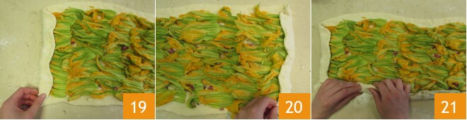 Feche o lado curto de um lado 19 e do outro 20 e continue enrolando o lado longo 21.