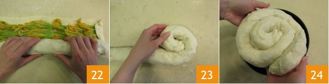 Assim você obterá um rolo bem grosso 22 e em seguida enrole-o formando um caracol 23. Transfira para uma forma de 22 cm com papel manteiga na base e untada na circunferência 24. Cubra com um pano limpo e deixe descansar por 30 minutos.