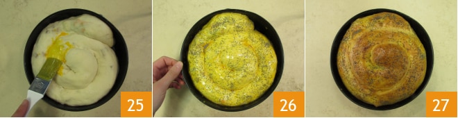 Passado o tempo, pincele a superfície com a gema e um pouco de leite misturados 25, polvilhe com sementes de papoula e proceda com a cocção 26: o rústico com salame e flores de abóbora assa em forno estático, já aquecido a 180°, por cerca de 45 minutos. Saboreie-o morno.