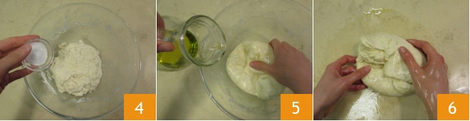Quando os ingredientes estiverem misturados, incorpore primeiro o sal 4 e depois o óleo aos poucos 5. Termine a fase de amassar na superfície de trabalho até que o óleo seja completamente absorvido 6.