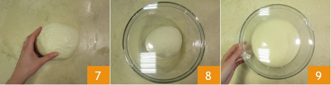 Forme uma esfera lisa e homogênea 7, coloque-a em uma tigela untada e cubra com filme plástico 8. Deixe levedar por cerca de 2 horas, ou até que a massa dobre de tamanho, sob uma coberta de lã ou a uma temperatura constante de 26-28° 9.