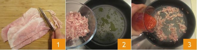 Para preparar a arvorezinha de massa, coloque uma panela cheia de água para ferver a massa, adicione sal e leve à fervura. Depois, coloque outro pouco de água para ferver em uma panelinha (você vai precisar para branquear por alguns instantes as ervilhas para a decoração). Pegue as fatias de presunto e corte 100 g primeiro em tiras 1; depois pique grosseiramente com a faca. Em uma panela grande o suficiente, aqueça um fio de óleo e doure brevemente o presunto cozido 2. Após alguns instantes, adicione o purê de tomate 3.