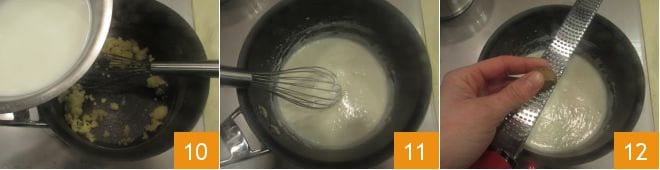 Uma vez realizado o roux, despeje o leite quente 10 e continue a mexer com o batedor até que engrosse 11. A consistência deve ser bastante fluida e o molho bechamel não deve ficar muito compacto. Tempere o molho bechamel com sal e rale a noz-moscada 12.