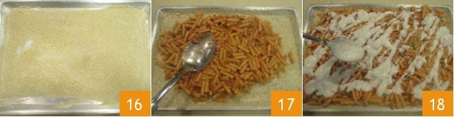polvilhe com pão ralado cobrindo bem toda a superfície 16. Despeje a massa, espalhe bem por toda a assadeira ajudando-se com as costas de uma colher 17 e espalhe colheradas de molho bechamel. Coloque a massa em forno estático pré-aquecido a 200° por cerca de 5 minutos 18.