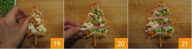 Após o tempo indicado, retire do forno e deixe a massa amornar: depois, comece a cortar em quadradinhos, dividindo cada um ao meio para obter dois triângulos, que serão suas arvorezinhas. Decore suas arvorezinhas com as ervilhas que você reservou 19, posicionando como se fossem as bolinhas da árvore. Corte 50 g do presunto reservado em tiras e coloque 2-3 na arvorezinha como festões decorativos 20. Sirva suas arvorezinhas de massa 24!