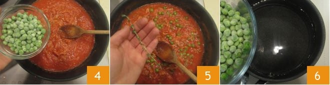 Adicione também 60 g de ervilhas 4. Adicione sal e aromatize com o tomilho desfolhado; cozinhe o molhinho por cerca de 5 minutos 5. Em uma panelinha à parte, branquear as 20 g restantes de ervilhas por alguns instantes, depois escorra e reserve 6.