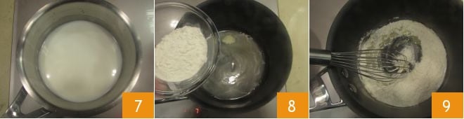 Agora, passe para o Bechamel: aqueça o leite em uma panelinha 7, assim que começar a ferver, desligue e mantenha aquecido. Em outra panelinha, derreta a manteiga em fogo bem baixo, quando estiver totalmente derretida, adicione a farinha 8 e mexa imediatamente com um batedor para evitar a formação de grumos 9.