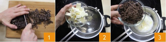 Para preparar as árvores de Natal brownies, comece fazendo o bolo: com a ajuda de uma faca, corte em pedaços bem pequenos o chocolate amargo 1. Derreta a manteiga em banho-maria 2, em fogo baixo, e depois adicione o chocolate 3: