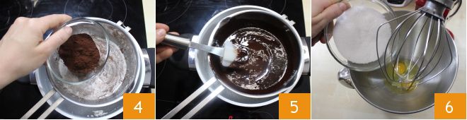 quando começar a derreter, adicione o cacau em pó 4. Continuando a mexer, deixe derreter até formar um creme denso e sem grumos 5. Quando os ingredientes estiverem completamente misturados, desligue o fogo e deixe esfriar um pouco. À parte, bata os ovos com o açúcar, usando uma batedeira ou um mixer elétrico 6,