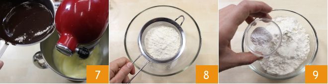 então adicione aos poucos a mistura de chocolate já morna 7. Em uma tigela, peneire a farinha 8, adicione o fermento 9, uma pitada de sal e misture bem para integrar todos os ingredientes.