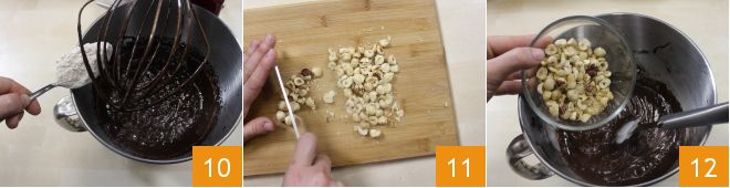 Adicione a farinha com o fermento à mistura de chocolate 10, uma colher de cada vez, mexendo bem e tomando cuidado para não formar grumos. Em uma tábua, pique grosseiramente as avelãs 11, usando uma faca, e depois adicione-as também à massa 12.
