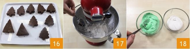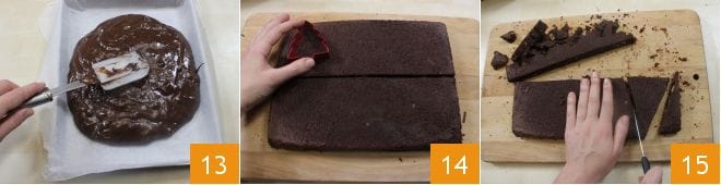 Agora despeje a massa em uma forma retangular de 20cm x 28cm, coberta com papel manteiga 13, e leve ao forno pré-aquecido, estático, a 180° por 20 minutos. Quando o bolo estiver pronto, deixe descansar por cerca de dez minutos antes de retirá-lo da forma. Após esse tempo, corte o brownie ao meio, já frio, horizontalmente e obtenha dos dois retângulos 10 arvorezinhas, usando um cortador de biscoitos em forma de árvore 14. Se não tiver o cortador, você pode cortar o bolo em triângulos iguais 15 (base de 7-8 cm e lados de 9 cm).