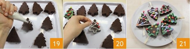 Agora decore as arvorezinhas desenhando na superfície de cada uma linhas em zig zag, ou delineando o contorno 19. Por fim, coloque as balinhas coloridas sobre o glacê ainda fresco 20, para que fiquem grudadas. Finalmente, pegue palitos de madeira e insira-os na base de cada árvore 21; se desejar, complete com uma pitada de açúcar de confeiteiro.