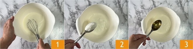 Para preparar os sacher cicciopancake, bata as claras em uma tigela com o batedor até ficarem espumosas 1. Adicione o iogurte grego 2 e o xarope de agave 3.